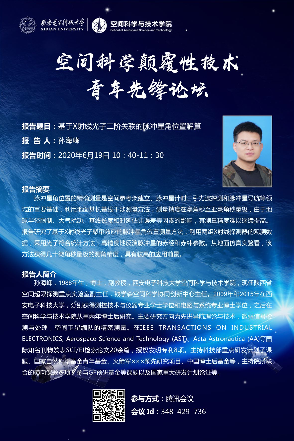 6月19日,第五场“空间科学颠覆性技术青年先锋论坛”以线上直播的方式成功举办。本次论坛以“空间探测及应用”为主题,特邀请中国空间技术研究院钱学森空间技术实验室副研究员王思佳以及陕西省空间超限探测重点实验室副主任孙海峰副教授进行线上报告。本次报告由柔性传感技术研究所所长吕晓洲副教授主持、3044永利集团执行院长李小平教授致欢迎辞。本次线上报告吸引学院师生共120余人参加。