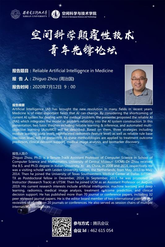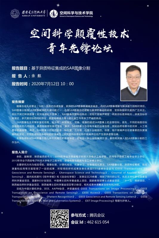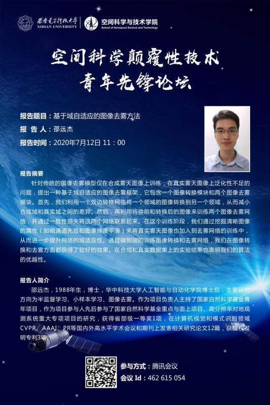 7月12日,第六场“空间科学颠覆性技术青年先锋论坛”以线上直播的方式成功举办。本次论坛以“智能图像处理”为主题,特邀请UCM大学助理教授周治国,我院导航控制系副教授余航以及华中科技大学博士后邵远杰进行线上报告。本次报告由柔性传感技术研究所所长吕晓洲副教授主持,学院师生共100余人参加此次线上报告。