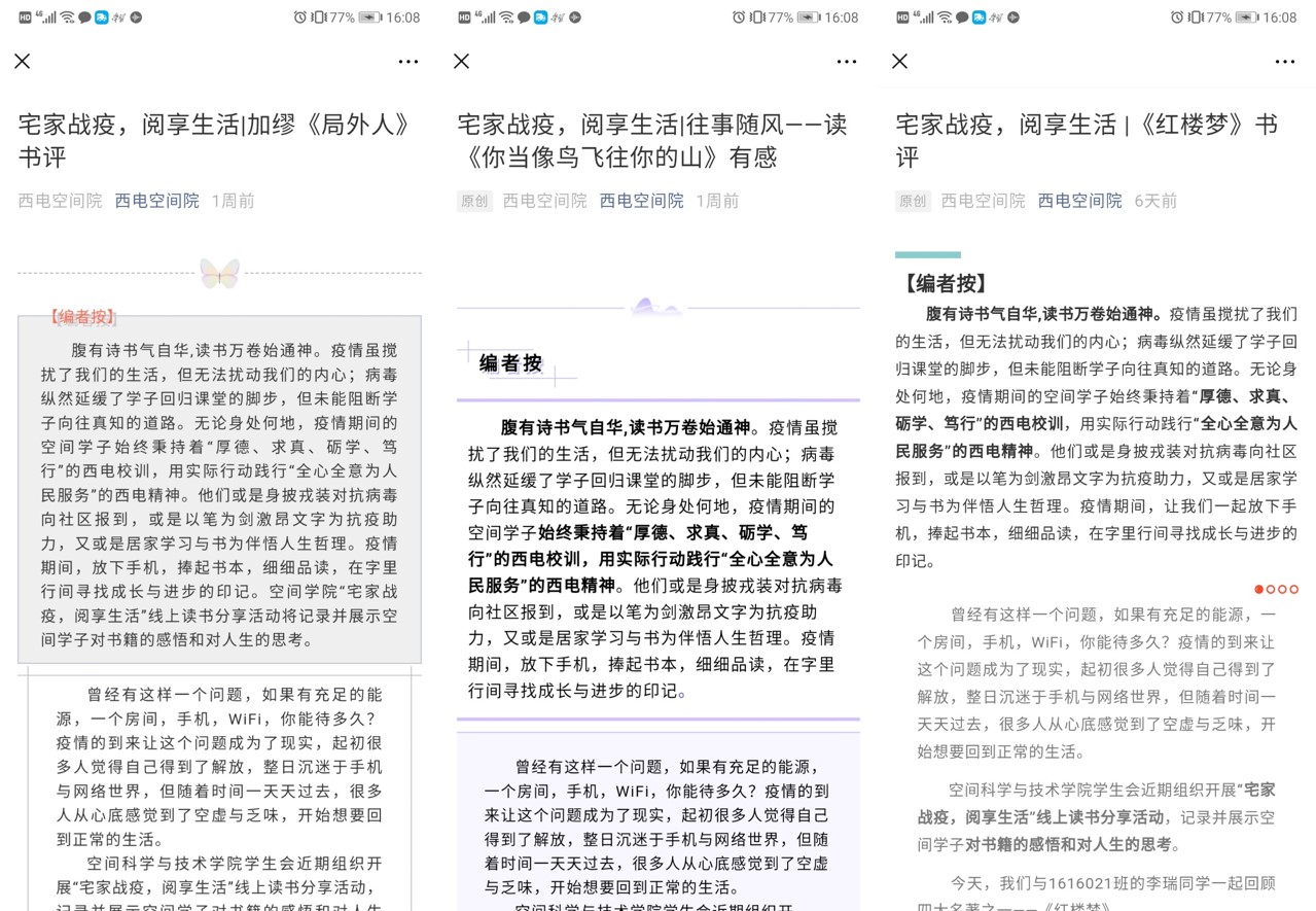 (通讯员郑瑞博 石泽康)腹有诗书气自华,读书万卷始通神。疫情期间,空间学子或是身披戎装对抗病毒向社区报到,或是以笔为剑激昂文字为抗疫助力,又或是居家学习与书为伴悟人生哲理。近期,空间学院学生会组织开展“宅家战疫,阅享生活”线上读书分享活动,动员学院全体学生居家抗疫期间放下手机,阅读书籍,在字里行间寻找成长与进步的印记,记录并展示对书籍的感悟和对人生的思考。
