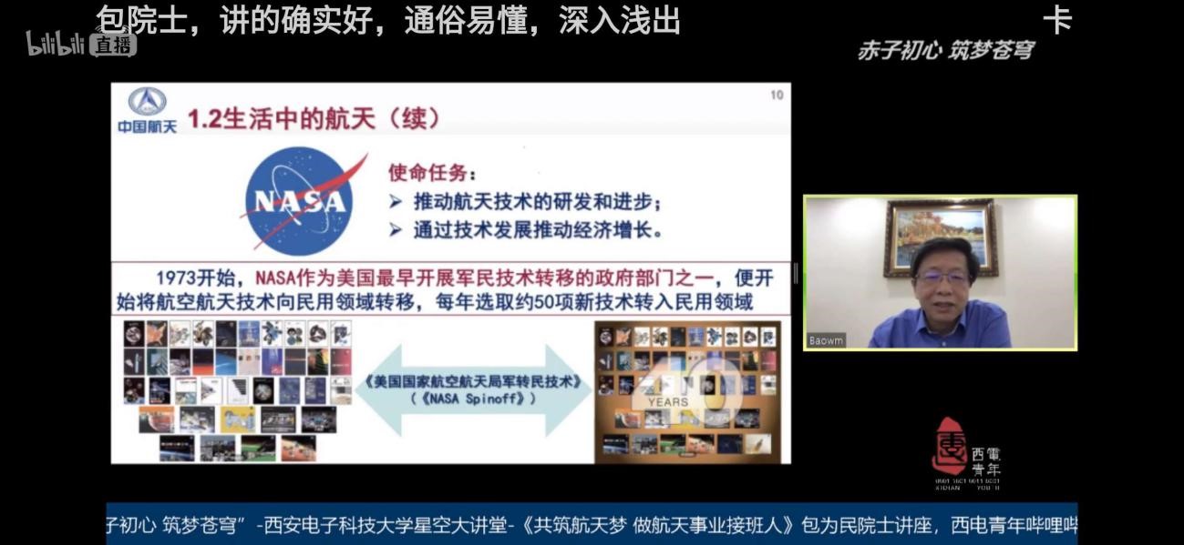 面向1.5万在线听众,包院士从什么是航天、生活中的航天讲起,详细介绍了世界航天的历史、现状和未来发展趋势,阐述了中国航天创新发展50年专注载人航天、探月工程、运载火箭、北斗卫星四大工程稳步登高的奋斗历程、当今航天领域研究热点—太空作战,以及中国航天未来发展领域,讲解辅以视频,生动展现了两器分离、月面全景等场景。