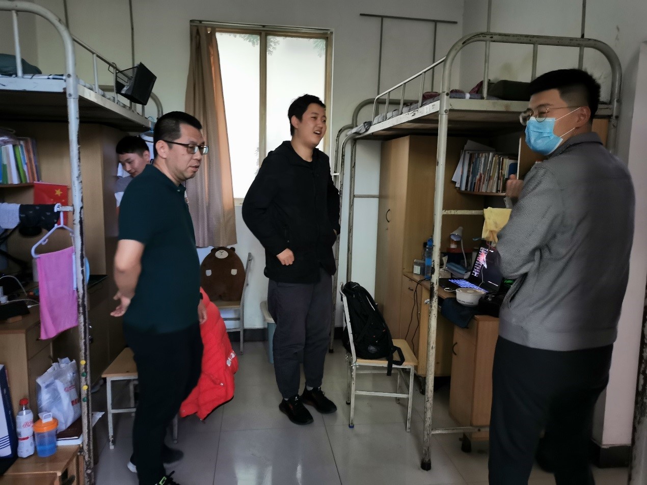 5月11日下午,学院党委书记朱文凯、党委副书记刘涛和毕业生辅导员席慧再次来到竹园宿舍,实地探望已经返校的学生,关切询问返校学生毕业设计、补考重修等学业上的困难和日常生活中的问题,及时帮助学生解决,并叮嘱同学们返校后一定要注意个人健康和卫生消杀,学院将尽最大努力为同学们做好服务工作。