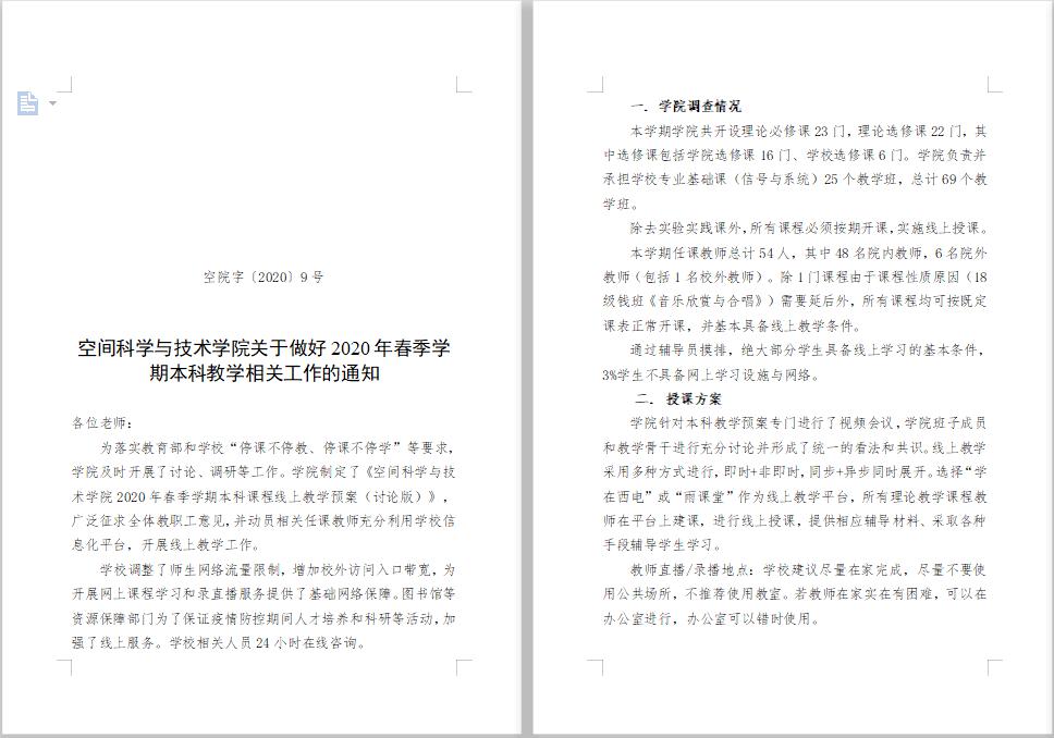 面对特殊时期下的教育教学挑战,空间学院高度重视,第一时间部署安排,形成《3044永利集团关于做好2020年春季学期本科教学相关工作的通知》,对全校公共专业基础课《信号与系统》、学院专业理论课程等线上教学实施进行部署,强调要转变教学理念、创新教学模式、最大限度保证教学质量,以迅速的响应、充分的准备和有力的措施保障学院教育教学工作同质等效。