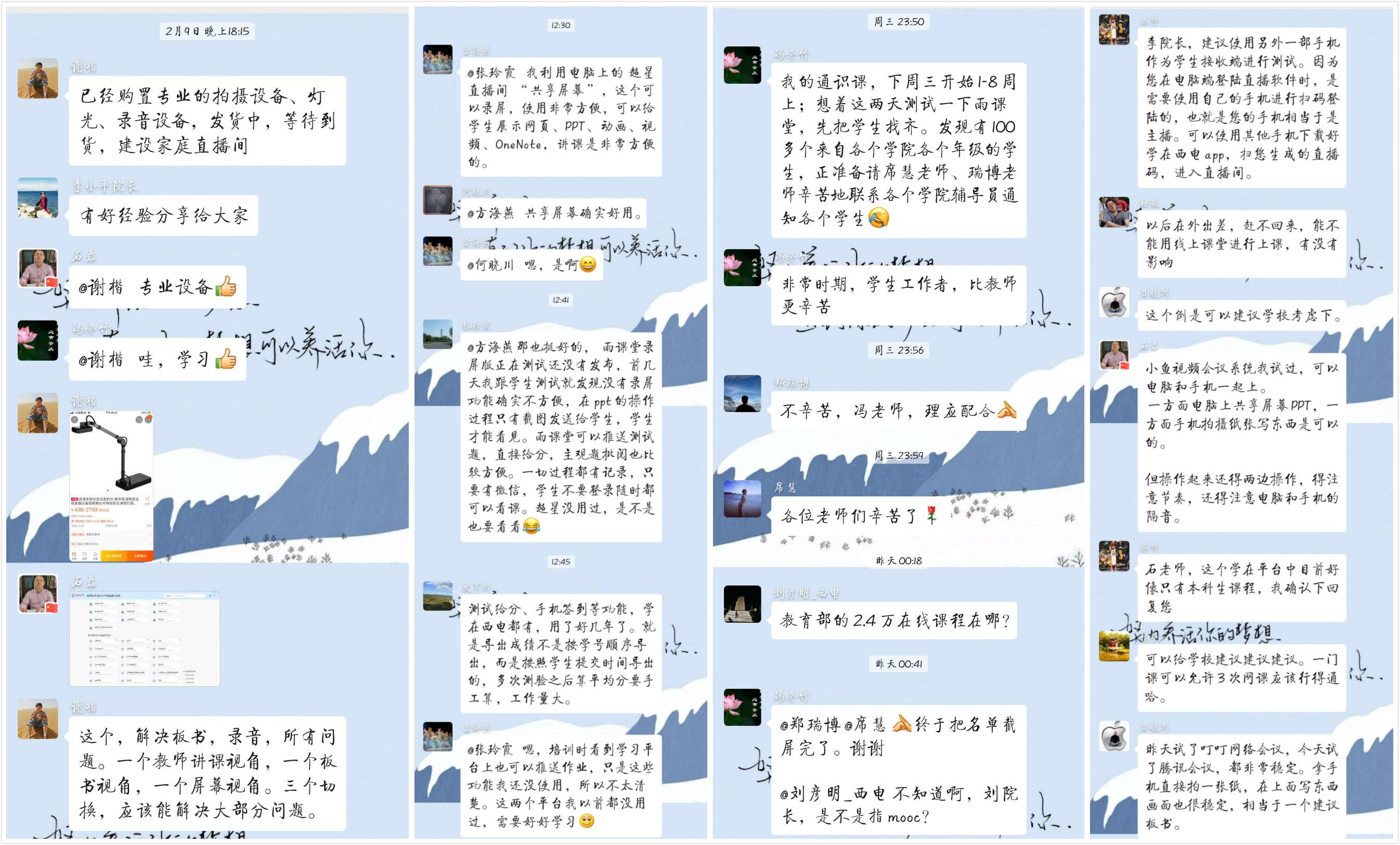 在“空间学院工作群”和“空间院本科教学群”中,一线教师们不舍昼夜、积极交流,你一言我一语,用最快的速度完成线上建课流程、熟悉线上教学工具、探索线上教学平台、讨论线上教学培训内容,反馈研讨线上教学测试出现的各类问题,为线上课程优化建言献策。