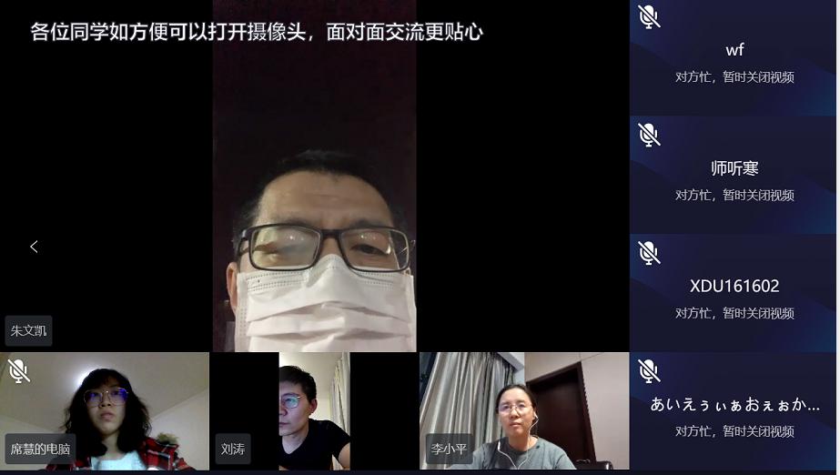 学院院长李小平表示,这次新型冠状病毒感染的肺炎疫情发生以来,学校和学院一直都很牵挂湖北省的学子以及有接触史的同学,每天都在关注着同学们的状况。今天这场特殊的线上视频交流,就是想通过这种方式直接和大家进行交流,为大家带来学院关切的同时聆听大家的困难和问题,第一时间予以解决。看到大家身体状况良好,在疫情面前镇定且理性,表现出了空间学子良好的素养,我们感到非常欣慰。 希望连线学生一方面要做好自我防护,积极响应国家号召,落实好当地各项防控要求。另一方面要坚定信心,调整好自己的心理和身体状况,积极利用线上教学及网络资源,做到“延学不停学”,为打赢疫情防控狙击战做出自己的贡献。