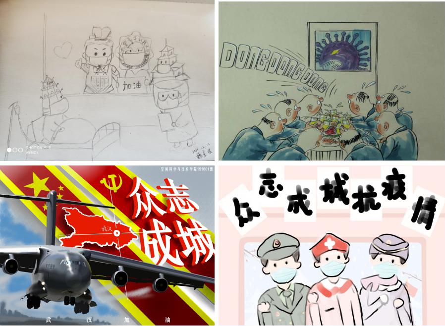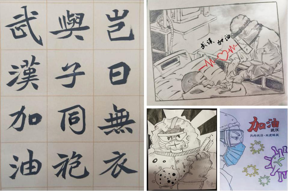 学院号召学生在学习之余通过网络关注疫情防控阻击战中出现的感人事迹和动人画面,并鼓励学生积极创作网文、诗歌、漫画、微视频等各类原创作品,积极在网络发声,弘扬青春正能量。学院2018级学生王一鸣结合个人所思所想,创作了一份朗诵词,词中写道“我们看见无数的人们,却只看见同一个愿望,这个愿望是要灾难快快过去,是要每个人都扛起自己的一份责任,一种担当。”学院2019级学生冯国翊在原创网文中提到“作为一名西电学子,我或许不能奔赴前线救死扶伤,也没有足够的力量去添砖加瓦,但我们用着我们自己的方式为武汉加油,为抗疫做出自己的贡献。就算这个寒假只能在家里守望,我们依然保持着乐观的心态,相信一起都会好起来,疫情终将会被战胜。”学院191601班和191602班录制了微视频,为武汉加油,为中国加油。网文、漫画、书法、诗歌,形式各有不同,但相同的是空间学子助力疫情防控阻击战的拳拳之心。