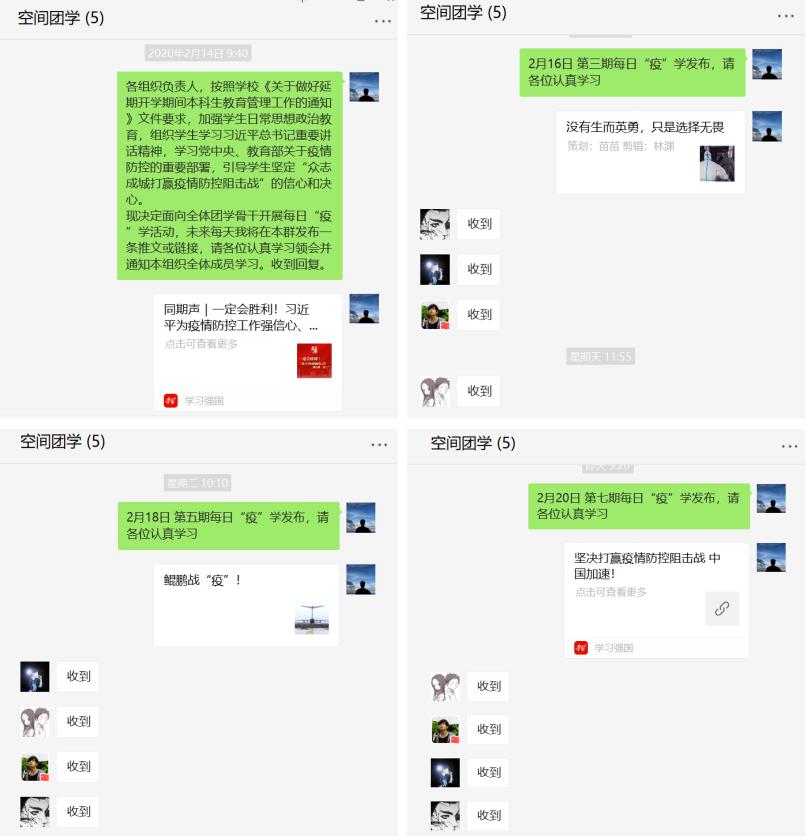 每天早上,空间学院团委学生骨干张博康都会收到这样的微信消息,“2月xx日 第x期每日“疫”学发布,请各位认真学习”,这是来自他所在的微信群“空间团学”中的消息,自2月14日开始,学院团委负责人郑瑞博每天早上都会在群里发布一条学习链接并通知全体团学骨干学习。张博康表示:“这次疫情出现以来,全国人民在党的领导下打响了疫情防控的阻击战,这背后反映是国家制度的优势,此次疫情防控阻击战便是一堂形象生动且内容丰富的‘思政课’,通过学习使我感触颇深、受益匪浅。”与此同时,学院还组织全体学生利用课余时间登录学习强国APP和人民日报、微言教育等微信订阅号及时学习习近平总书记重要讲话精神以及党中央、教育部各项决策部署,引导学生永葆初心、树立信心、坚定决心。