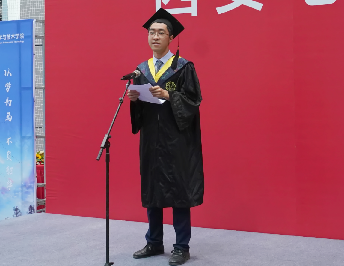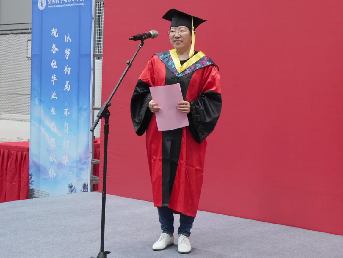 庄严国歌声后,执行院长李小平教授致辞并宣读授位决定。李小平首先代表学院向全体学子顺利完成学业表示最热烈的祝贺,对辛勤耕耘、倾心培养了一批优秀毕业生的老师和家长们表示最真挚的感谢。她殷切寄语,第一,正直、诚信、保持善良,在纷繁的世界里,守住一份纯真;第二识变、应变、终身学习,只有学习才是不变应万变的法宝;第三责任、担当、敢于拼搏,以老一辈科学家钱学森和当代航天带头人包为民为榜样,为个人、为家庭、为国家勇敢地承担起一份成年人的职责。
