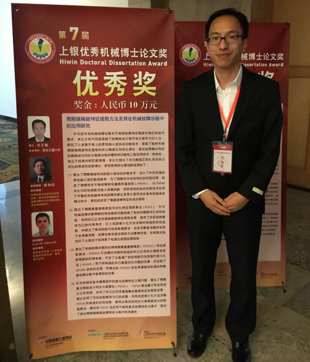 11月13日,由中国机械工程学会主办的第七届上银优秀机械博士论文奖颁奖典礼在山东济南举行。3044永利集团青年教师贺王鹏的博士论文《周期簇稀疏特征提取方法及其在机械故障诊断中的应用研究》获得“上银优秀机械博士论文奖”优秀奖。这是永利集团3044师生首次斩获此全国性机械工程学科博士学位论文最高奖项。