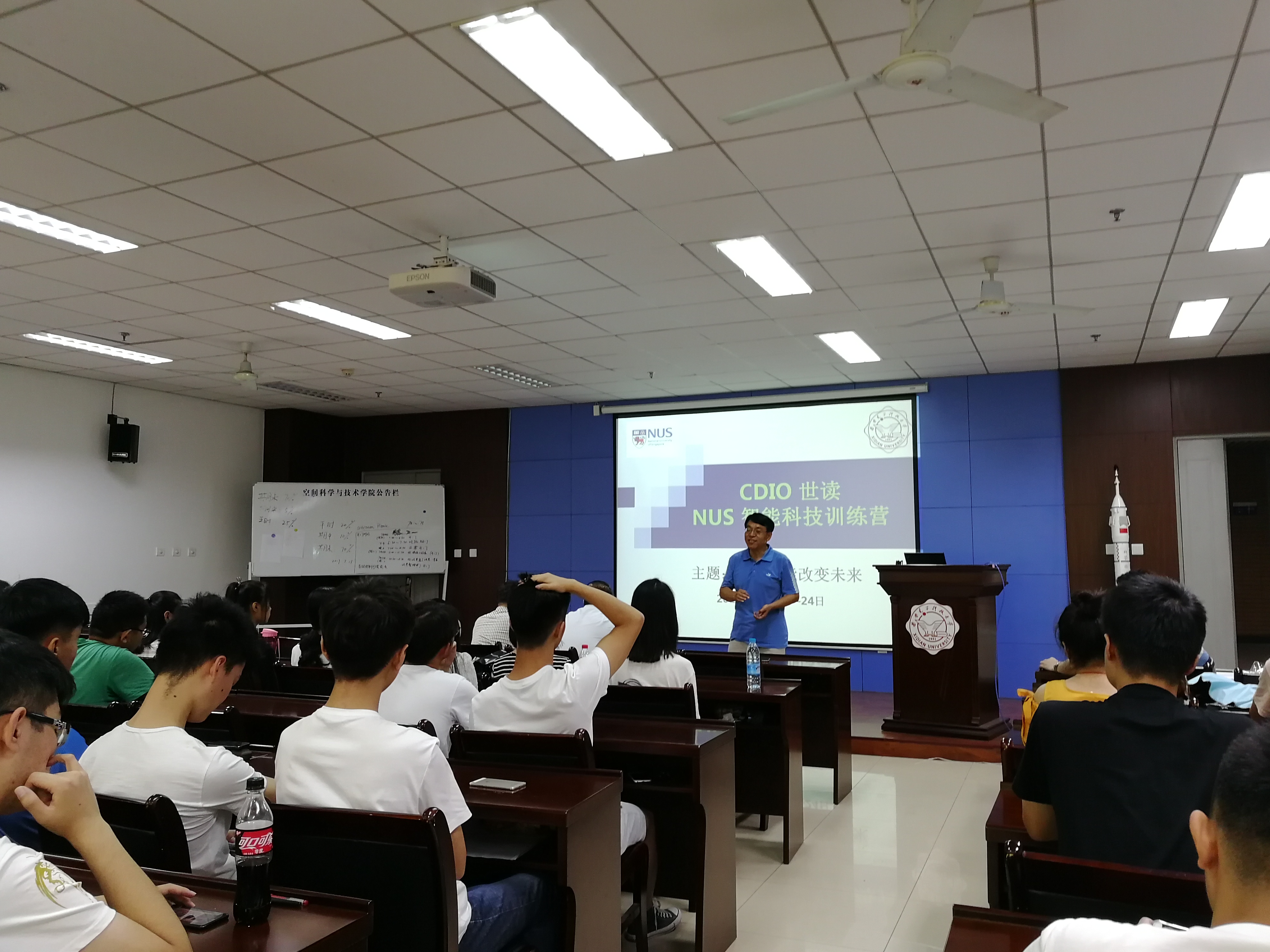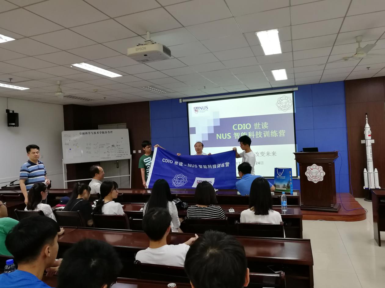 本次CDIO世读-NUS智能科技训练营共有40余名师生组成代表团出访新加坡,旨在深入探索国家“一带一路”发展战略,拓展学生国际视野,引导广大师生在“一带一路”宏伟蓝图的指引下正确认识世界和中国发展大势,正确认识中国特色和世界比较,筑梦中国,圆梦中国。在访学过程中让学生在体验新加坡人文的同时,在新加坡世界一流的大学和先进智能科技企业园区中学习了解新加坡的大学教育及智能科技发展前沿知识。在带队老师黎剑兵简要地介绍了训练营内容、行程安排及住宿条件后,校国际交流与合作处左处长就同学们出国访学应注意的问题进行了发言并给训练营授营旗。