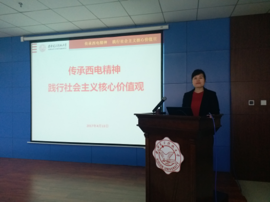 在专题报告中,吴秀霞老师从“为什么要提出践行核心价值观”、“如何将核心价值观内化于心”和“核心价值观与西电精神”三个方面对社会主义核心价值观的提出背景、内涵意义和实践途径进行了阐述。首先,吴老师从国家、社会和个人的角度,用丰富的时政事例和自己工作学习中的经历引出了社会主义核心价值观的概念,具体分析了核心价值观的丰富内涵。关于如何践行社会主义核心价值观,吴老师认为,培育和践行社会主义核心价值观是一项系统工程,关键要解决“信”和“行”的问题。在日常的学习生活中,青年学生必须立足中华优秀文化,讲仁爱、重民本、守诚信、崇正义、尚和合、求大同,积极参与社会实践和志愿服务,在群体中发挥榜样的示范引领作用。最后,吴老师还用六则西电校史中的小故事带领同学们回顾了母校成长发展的峥嵘岁月和光辉历程,半部电台起家的历史让同学们对于艰苦奋斗、自强不息、求真务实、爱国为民的西电精神有了更深的体会。勤学、修德、明辩、笃实,将社会主义核心价值观内化于心、外化于行需要每一个践行者持之以恒的努力和不忘初心的坚持。