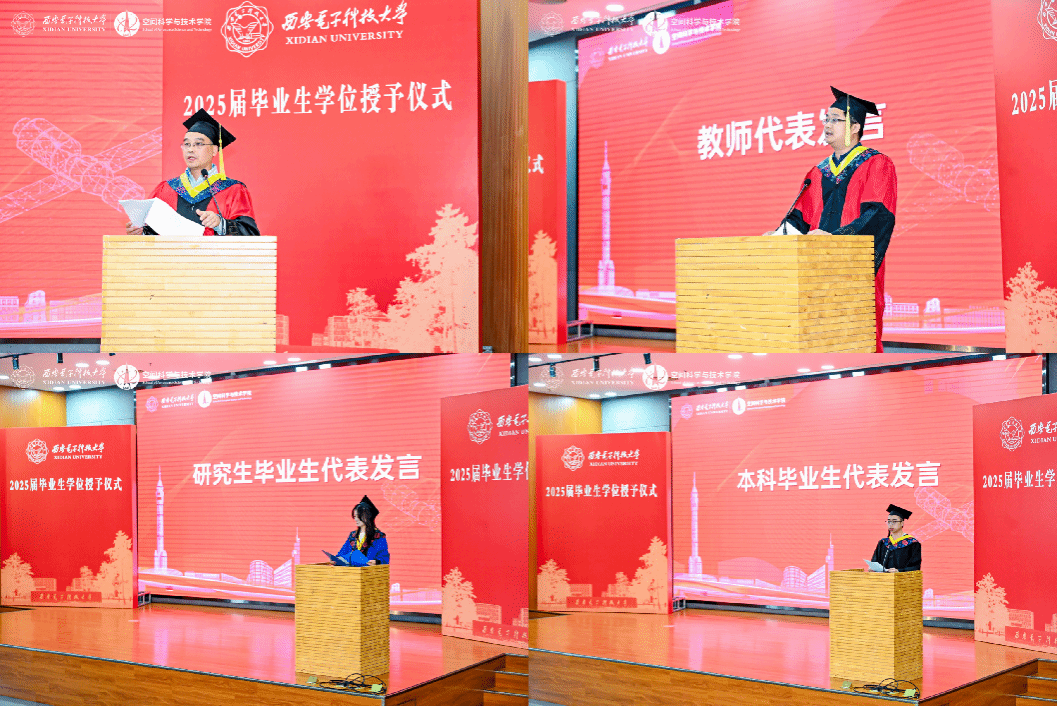 研究生毕业生李锦和本科毕业生杜浩南代表2025届毕业生向母校、师长、同窗及家人致谢,回顾了自己在西电的求学时光。他们表示,毕业后将以“厚德、求真、砺学、笃行”的校训为精神灯塔,以“胸怀祖国、勇于探索、知行合一、团结协作”的学院精神为行动坐标,在各自的岗位上发光发热,为国家科技发展和社会进步添砖加瓦。