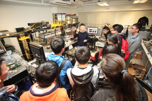 在香港理工大学,学生们与来自不同国家的同学进行了交流,随后参观了理工大学光通信实验室和蓝光LED实验室。