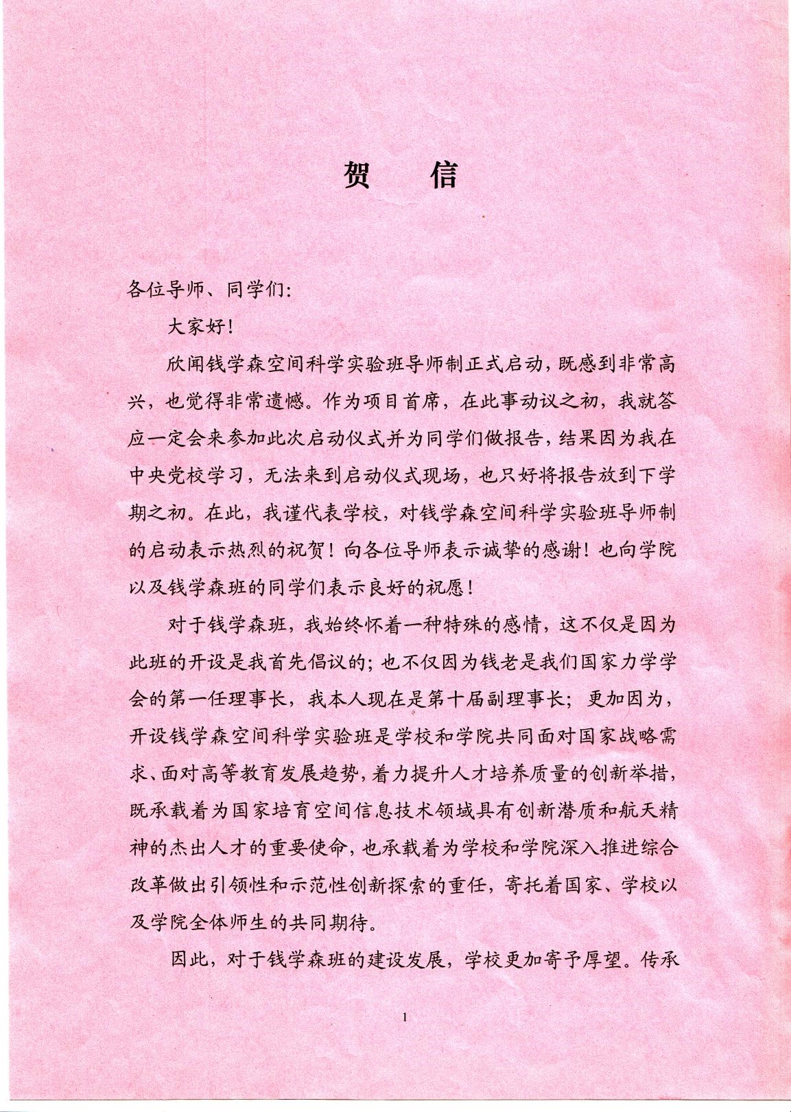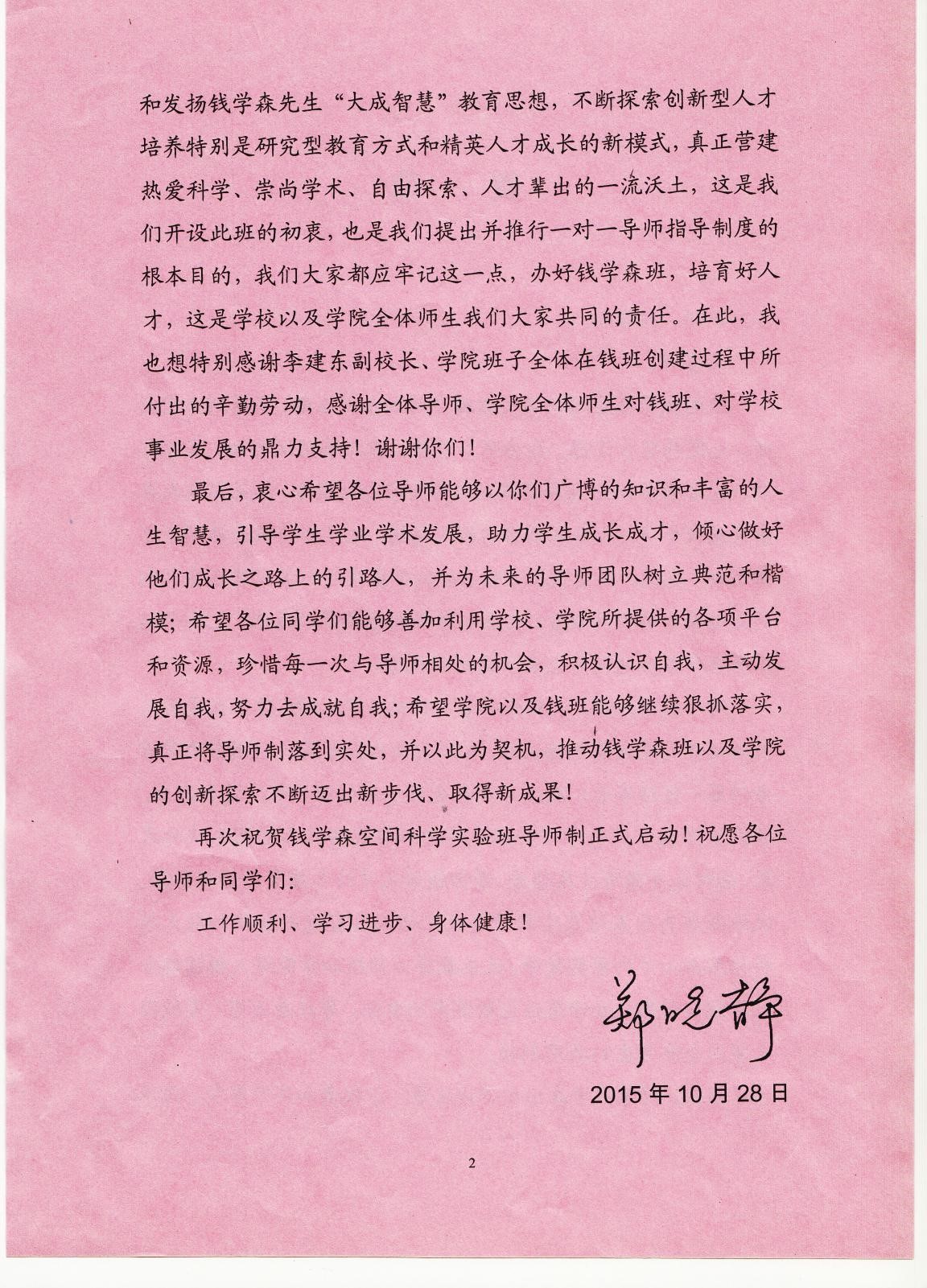 龙建成副书记宣读了校长郑晓静院士发来的贺信,郑校长在信中说到:钱学森班是学校和学院共同面对国家战略需求、面对高等教育发展趋势,着力提升人才培养质量的创新举措。希望导师们能够继承和发扬钱学森先生“大成智慧”教育思想,不断探索创新型人才培养,特别是研究型教育方式和精英人才成长的新模式。营建热爱科学、崇尚学术、自由探索、人才辈出的一流沃土。以广博的知识和丰富的人生智慧,引导学生学业学术发展,助力学生成长成才,倾心做好学生成长之路的引路人。