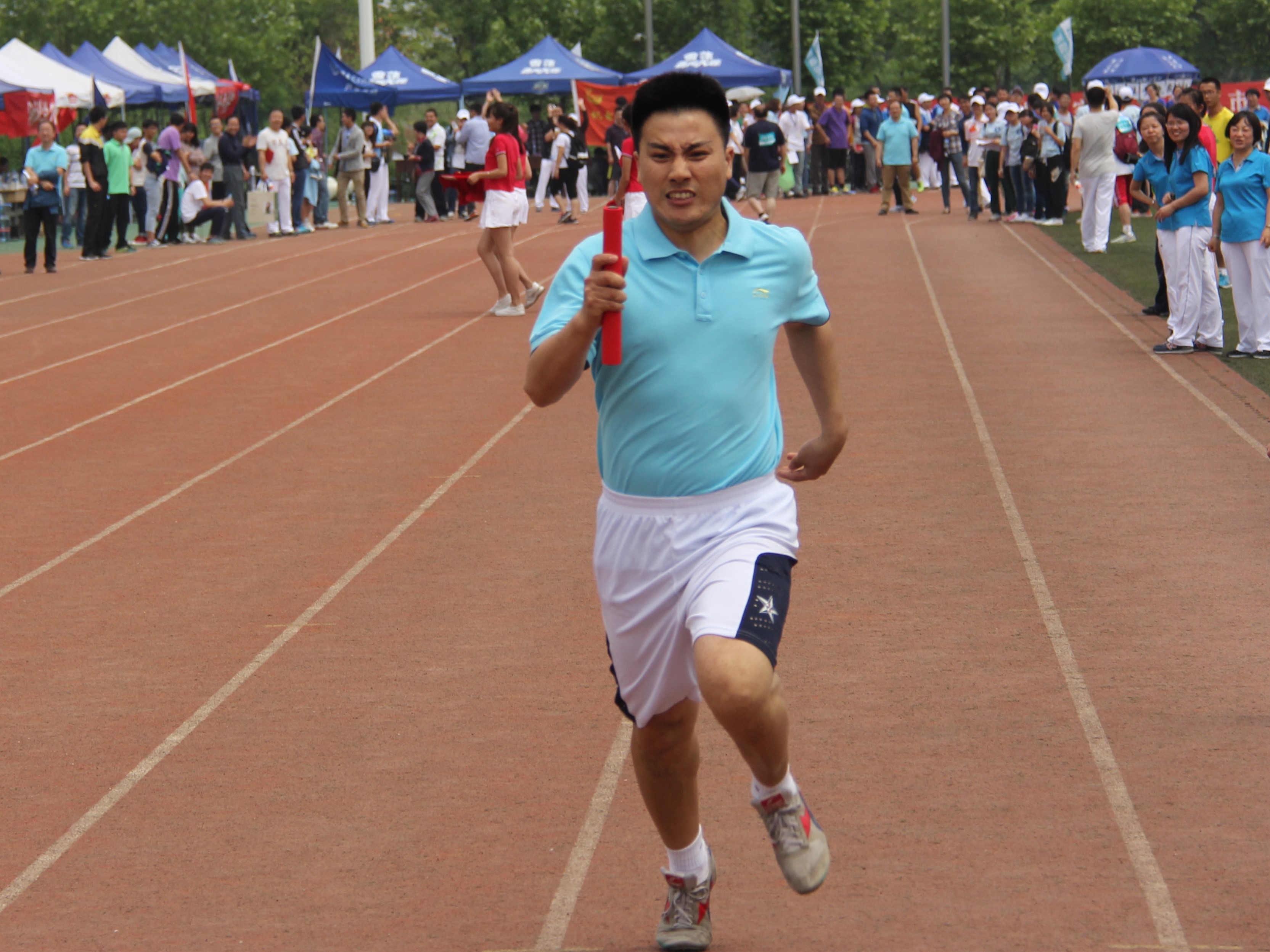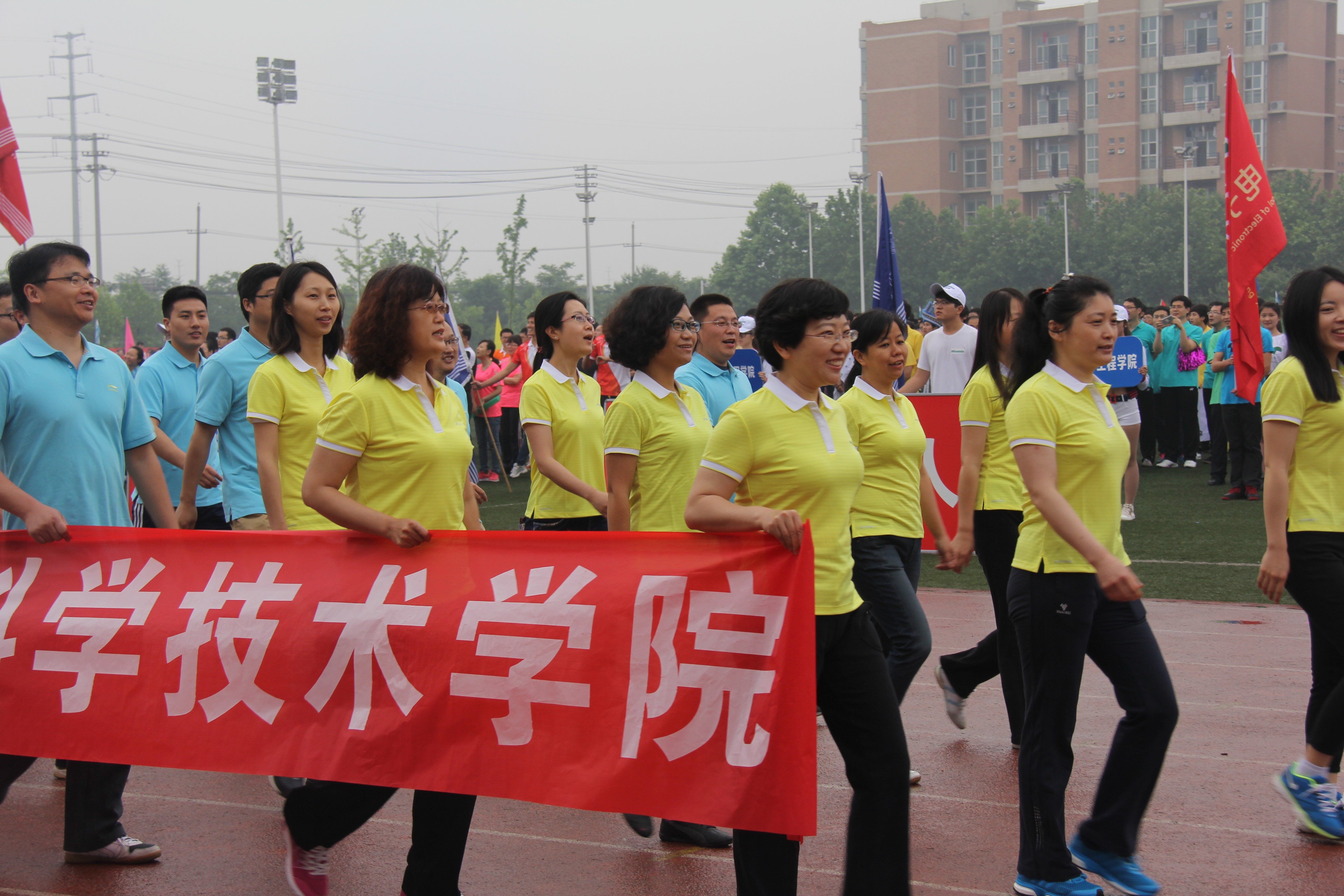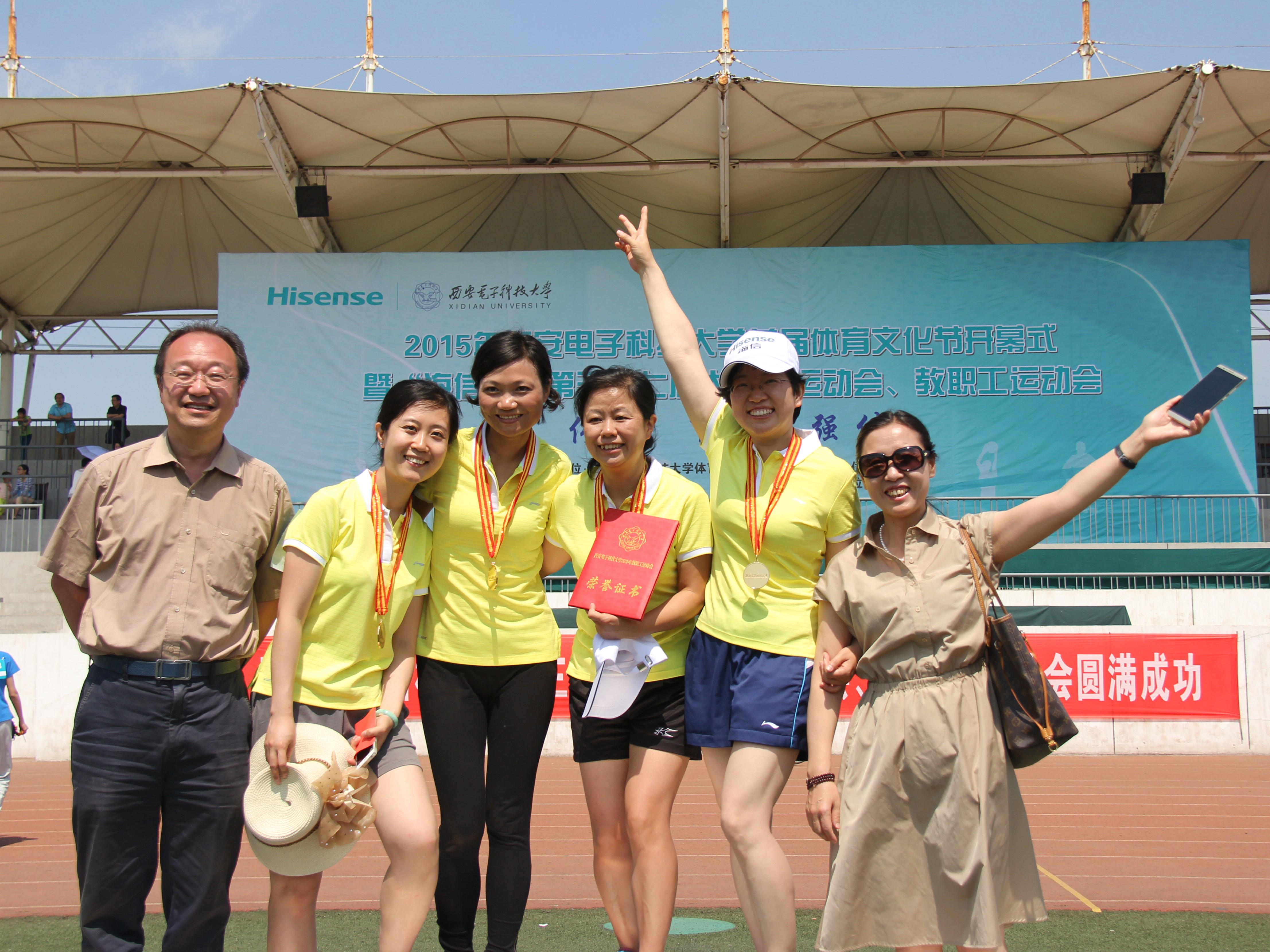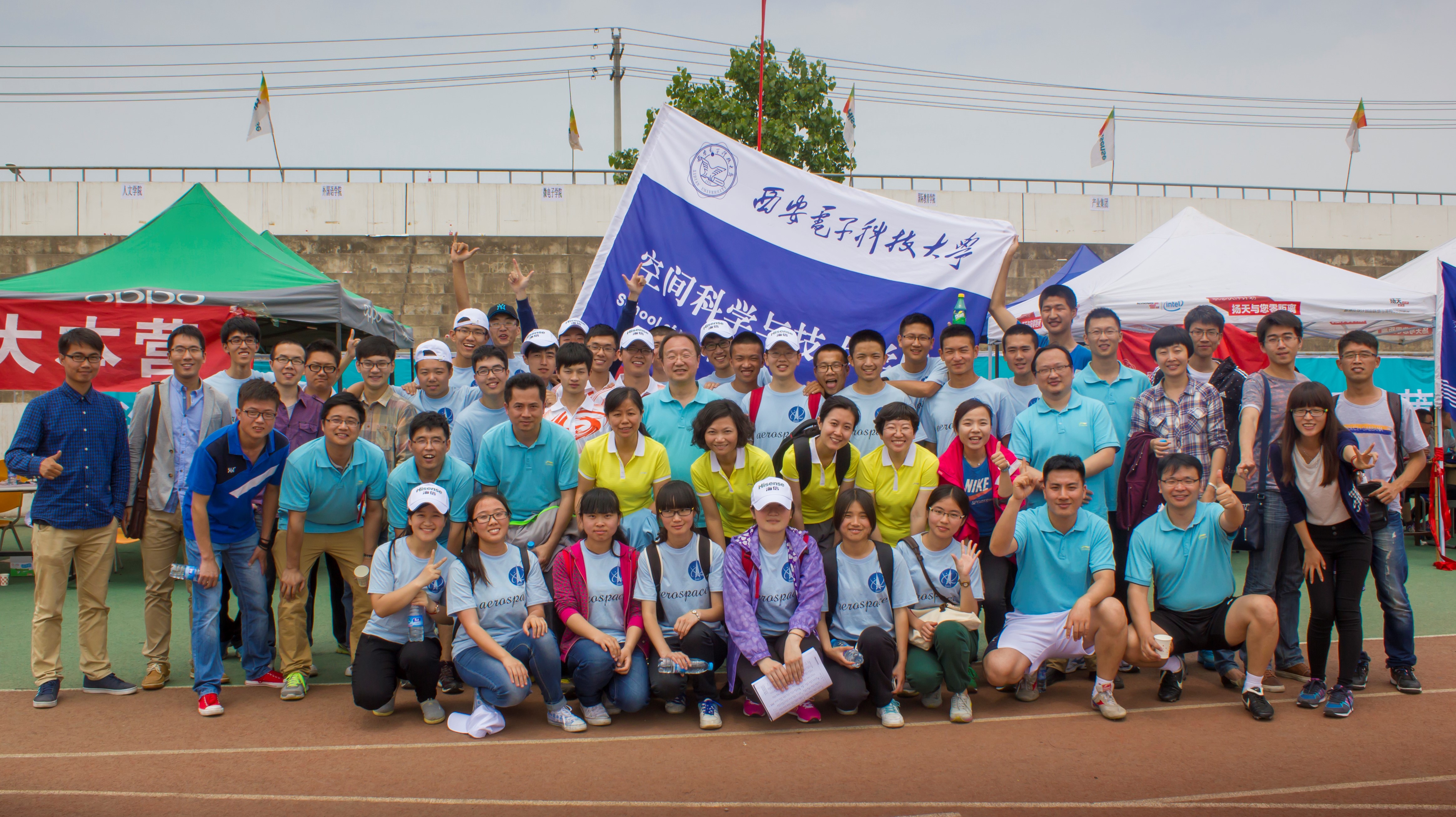 除了别具一格的开幕式表演,空间学院的师生在本次运动会上取得的成绩也同样令人自豪。虽然学院的师生人数与其它学院比较相去甚远,但是空间师生取胜的决心和信心、团结一致的精神面貌却毫不逊色,在教师女子4×100米接力比赛中我院获得第一名的好成绩,一道炫丽的黄色在跑道上划出了美妙的弧线,第一棒,第二棒,老师们渐渐逼近终点,她们斗志昂扬,一鼓作气摘得桂冠。场边整齐的加油呐喊声震耳欲聋,颁奖台上的骄傲和自豪溢于言表。