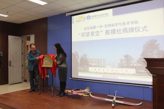 揭牌仪式上,高新一中副校长张清彦老师首先致辞,她说,“钱学森班”是继承钱学森大成智慧教育理念,探索钱学森空间科学创新人才培养方法的重要举措,“仰望星空”航模社的共建,是增强高校与中学联系又一项有重大意义的活动。随后,空间院党委书记梁玮和高新一中副校长张清彦一同为航模社揭牌。最后,空间院执行院长李小平教授发表讲话并向高新一中师生们介绍了学校钱学森空间科学实验班的相关情况,她在讲话中说到,“钱学森班”的成立是学校提升本科教育质量,以及推动学校发展的重要举措之一,我们要传承著名科学家钱学森先生“大成智慧”的教育思想,探索创新型人才培养模式,培养空间科学与航天技术领域的领军人物,对于钱学森之问做出具体的探索和行动。