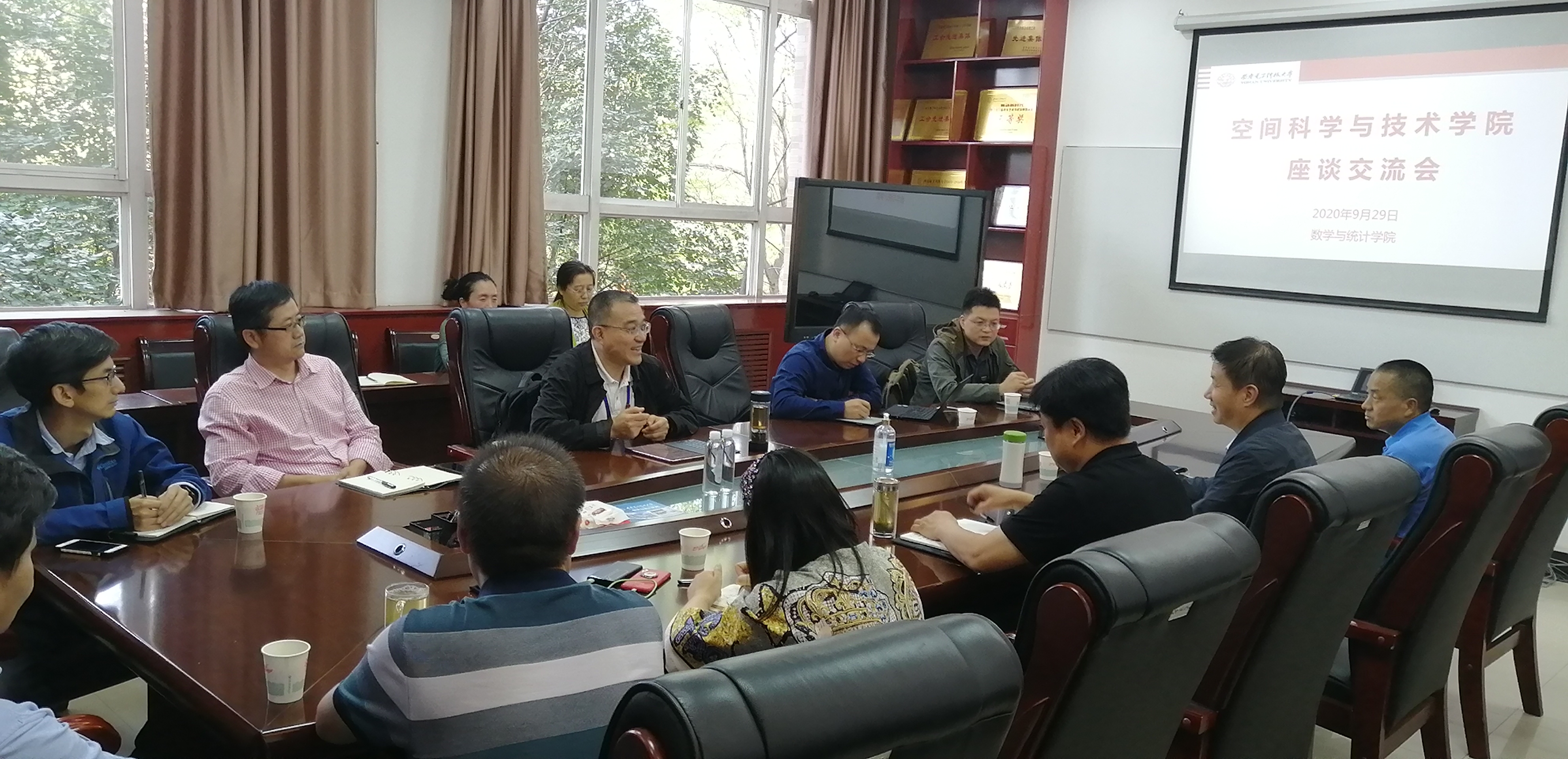 (尚保强)2020年9月29日,空间学院各科研团队骨干在执行院长刘彦明教授、科研副院长石磊副教授的带领下,赴数学与统计学院进行调研学习及交流,数学与统计学院党委书记杨生海、院长马如云教授、副院长王晓华以及学院教师骨干参与了交流。双方就科研合作以及人才培养进行了深入探讨。交流座谈会在南校区信远二区205会议室举行。
