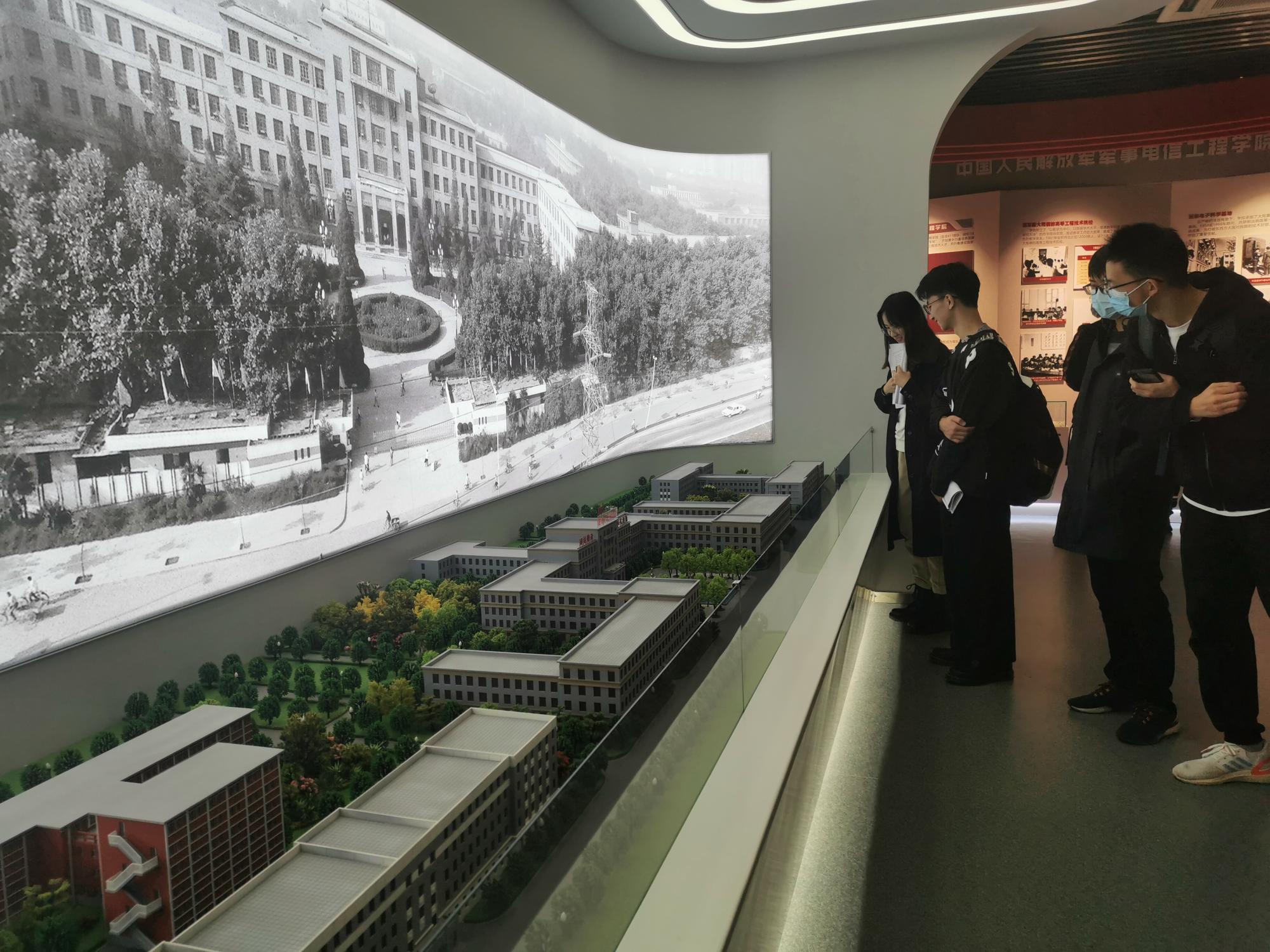 在“校史钩沉”板块,讲解员介绍了西电在长征路上的办学故事以及电影《永不消失的电波》主人公原型李白,让大家感受这些作品中融入的西电先辈们的坚定信念与无私付出。跟随讲解员的步伐,借助大量图片、历史档案资料,以及学校立体沙盘模型、窑洞复刻等,学生进一步了解了学校的发展变化,充分感受西电的光辉历史。