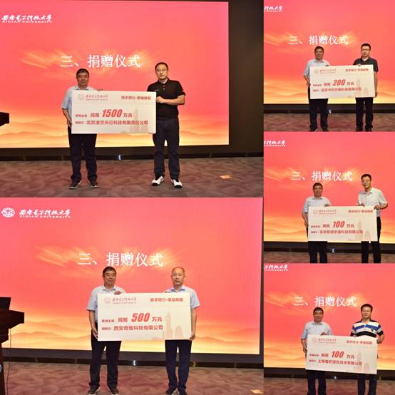 捐赠仪式上,杨银堂代表学校接受捐赠并为企业负责人颁发证书。北京凌空天行科技有限责任公司董事长王毓栋向学校捐赠1500万元,西安奇维科技有限公司董事长刘升向学校捐赠500万元,北京中科内镜科技有限公司总经理张金刚向学校捐赠200万元,北京紫微宇通科技有限公司西安分公司总经理药亮向学校捐赠100万元,上海卷积通讯技术有限公司董事长薛玉磊派代表向学校捐赠100万元。捐赠总额共计2400万元。