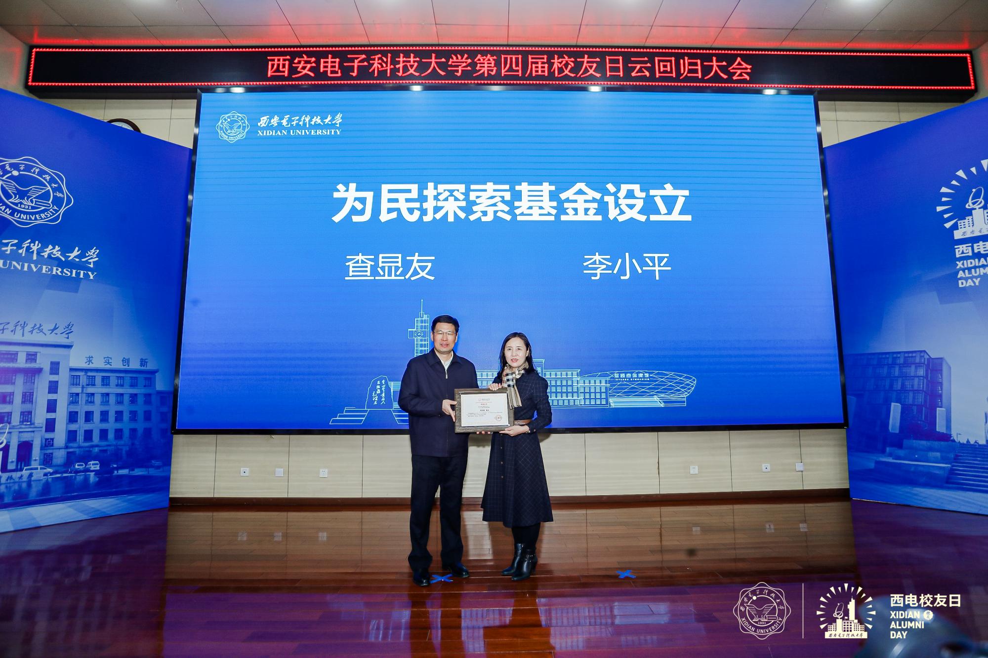 捐赠仪式上,党委书记查显友代表学校接受“为民探索基金”捐赠,并为捐赠代表颁发捐赠证书。西电航天行业校友会秘书长、极端环境教育部重点实验室主任李小平教授作为捐赠代表接受捐赠证书。