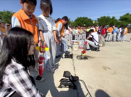 在荆姚九年制学校操场,空间学院面向荆姚学校学生开展“星空梦想课程”,学院学生党史宣讲团成员们围绕学院航天金课系列活动、学院科技创新成果以及学生优秀科技作品开展宣讲,带领荆姚学校学生探索科技前沿、感受创新魅力。空间学院科创小组成员指导荆姚学校学生用废弃可乐瓶现场制作了火箭模型,并通过发射架和加压器完成了“水火箭”的发射升空,“水火箭”的每一次腾空而起都引发了现场学生的阵阵欢呼,学生科技作品真正成为了荆姚学校学生们接触和体验科学的有效载体,发射环节结束后,小组成员结合个人所学为现场学生介绍了我国航天科技事业的发展情况与西电航天校友的突出贡献。