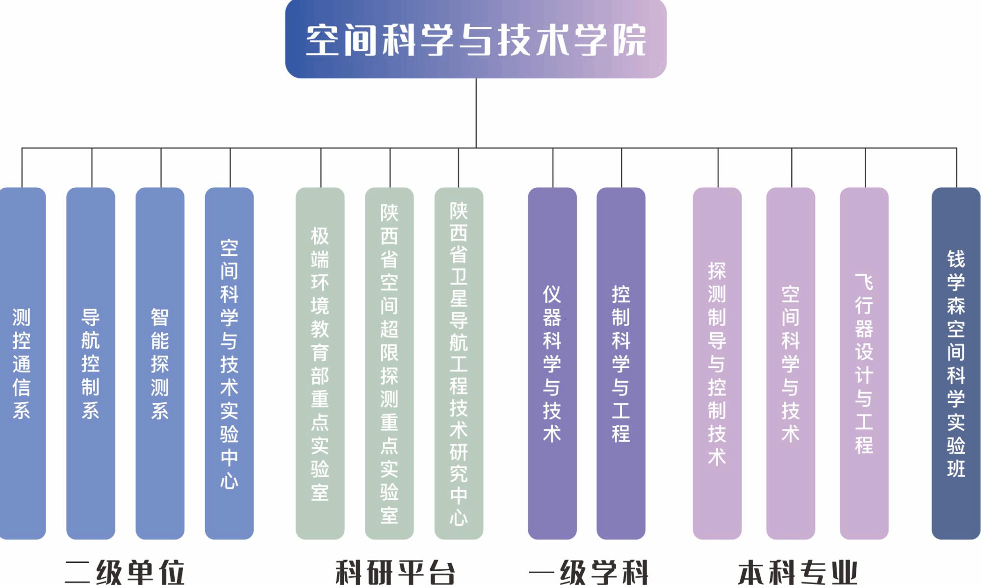 学院设有测控通信系、导航控制系、智能探测系和空间科学与技术实验中心等3个系及1个实验中心,并设有飞行器测控通信研究所、导航探测与制导研究所、智能控制与图像工程研究所和力学系统与先进控制研究所等4个研究所。在研究生培养中,学院注重校企合作,以培养创新性人才为目标,建有钱学森空间科学人才培养基地(与钱学森空间技术实验室共建)、临近空间飞行器测控及特种测量技术联合研究中心(与空间物理重点实验室共建)、空间测控通信技术联合创新实验室(与北京遥测技术研究所共建)、教育部卫星导航技术研究中心导航新系统分中心、陕西省卫星导航工程技术研究中心。